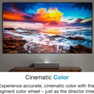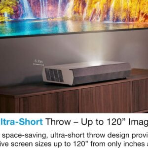 This projector produces 3000 lumens brightness, allowing clear, bright images even in ambient-lit rooms. Furthermore, its ultra-short-throw lens projects a 120-inch screen from just 14 inches away, reducing shadows and optimizing placement in living spaces.