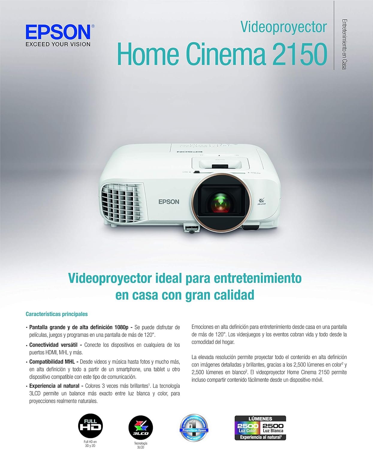 Epson incorporates 3LCD technology to deliver 2,500 lumens of equal color and white brightness for a consistently vibrant display. Consequently, you avoid the common rainbow effect seen in other projection types and enjoy a picture that stays true to the director’s original vision.