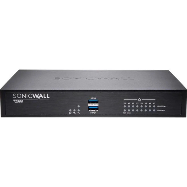 The SonicWall TZ500 (01‑SSC‑0445) is a next-generation network security and firewall appliance designed to protect small and mid-sized business networks with advanced threat defense and high-speed connectivity. Additionally, it combines multi-gigabit wired connections, integrated wireless support, and centralized management to secure both wired and wireless traffic efficiently.