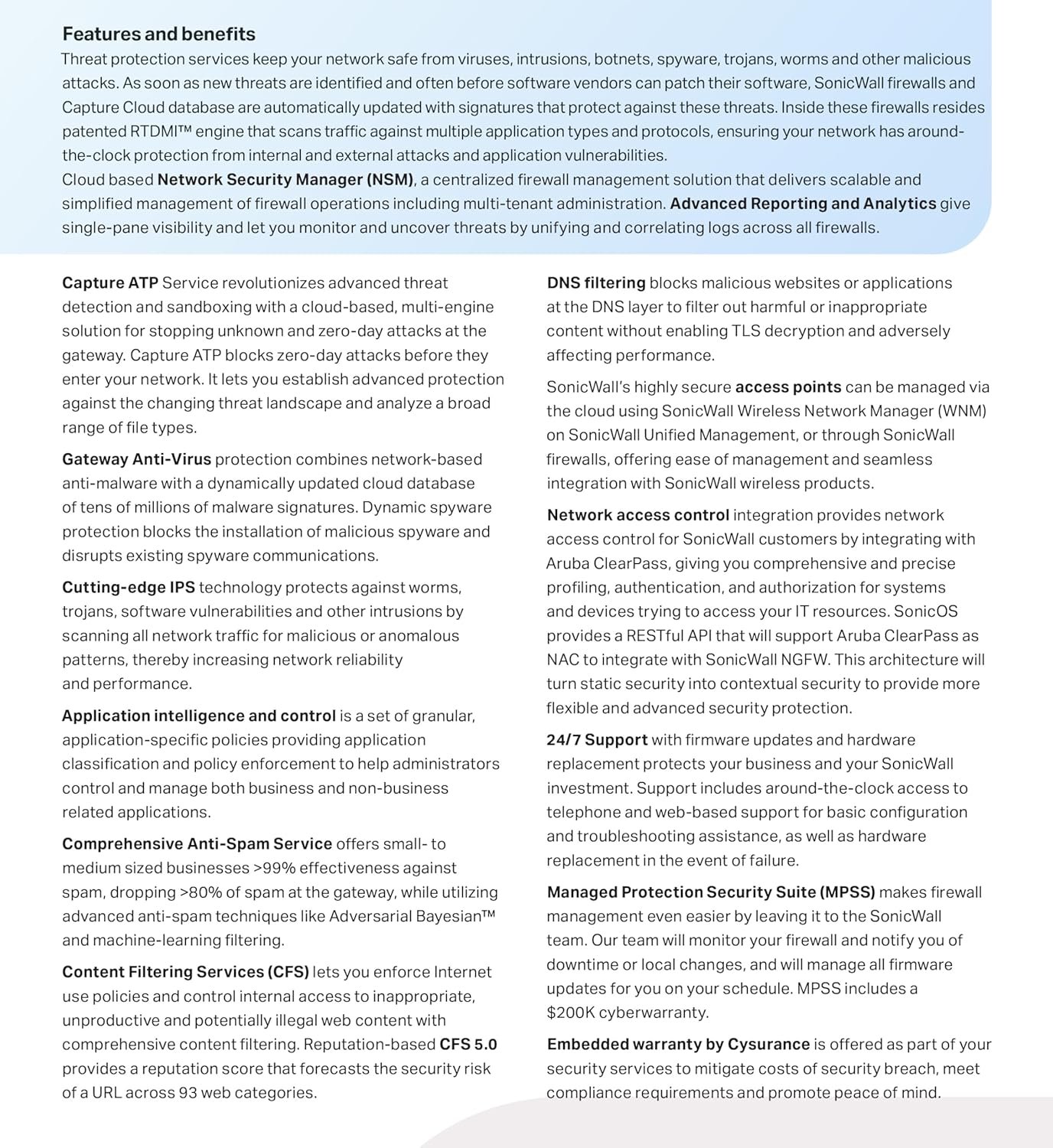 The TZ570 integrates with advanced security services, including sandboxing for zero-day threat detection and endpoint protection for complete defense. It supports multiple networking protocols, authentication methods, and quality of service (QoS) controls, enabling precise traffic management and policy enforcement. Additionally, the appliance supports IPv6, ensuring long-term compatibility as businesses transition to modern protocols.