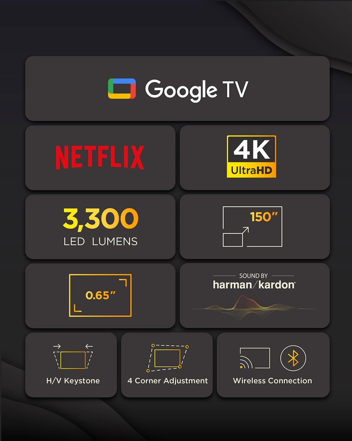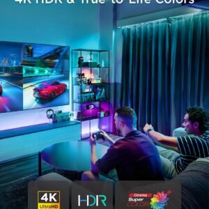 The X1-4KPRO integrates Google TV for seamless access to apps like Netflix, Disney+, and YouTube. In addition, it features HDMI, USB 2.0, 3.5 mm audio output, and Bluetooth 5 connectivity for gaming consoles, speakers, and external devices.