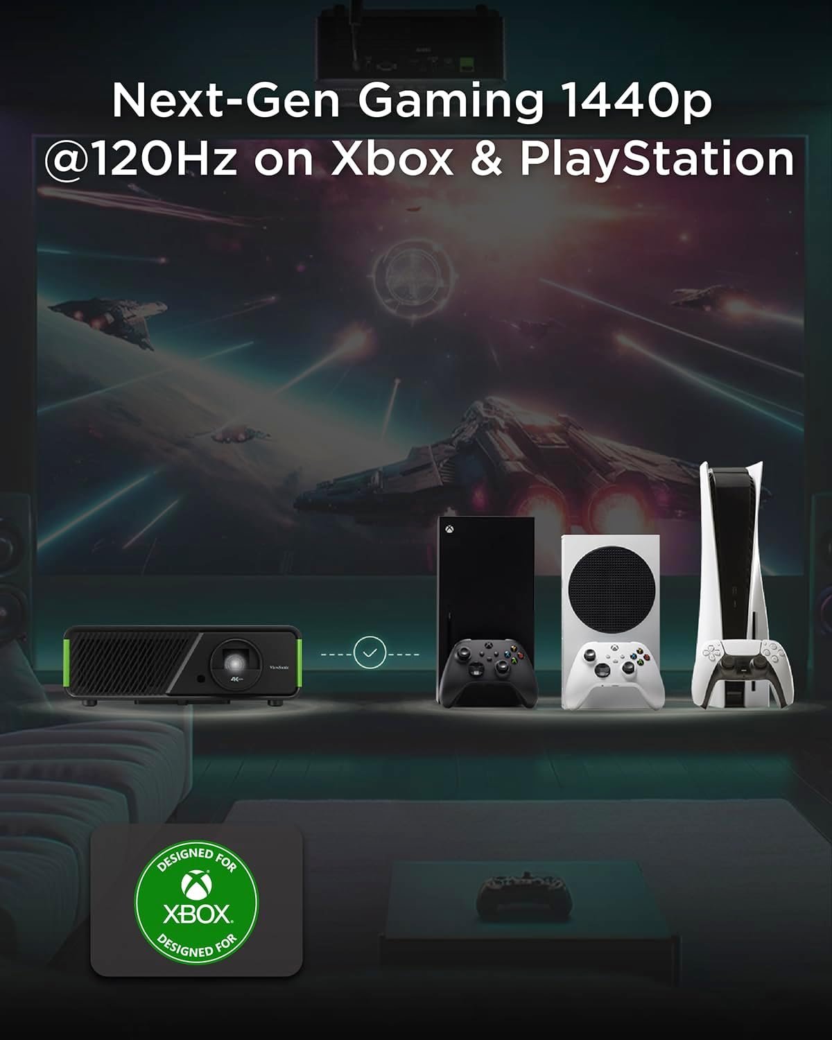 It supports low-latency gaming optimized for Xbox with high refresh rates and minimal input lag. As a result, gamers experience smooth, responsive gameplay on a large projected screen.