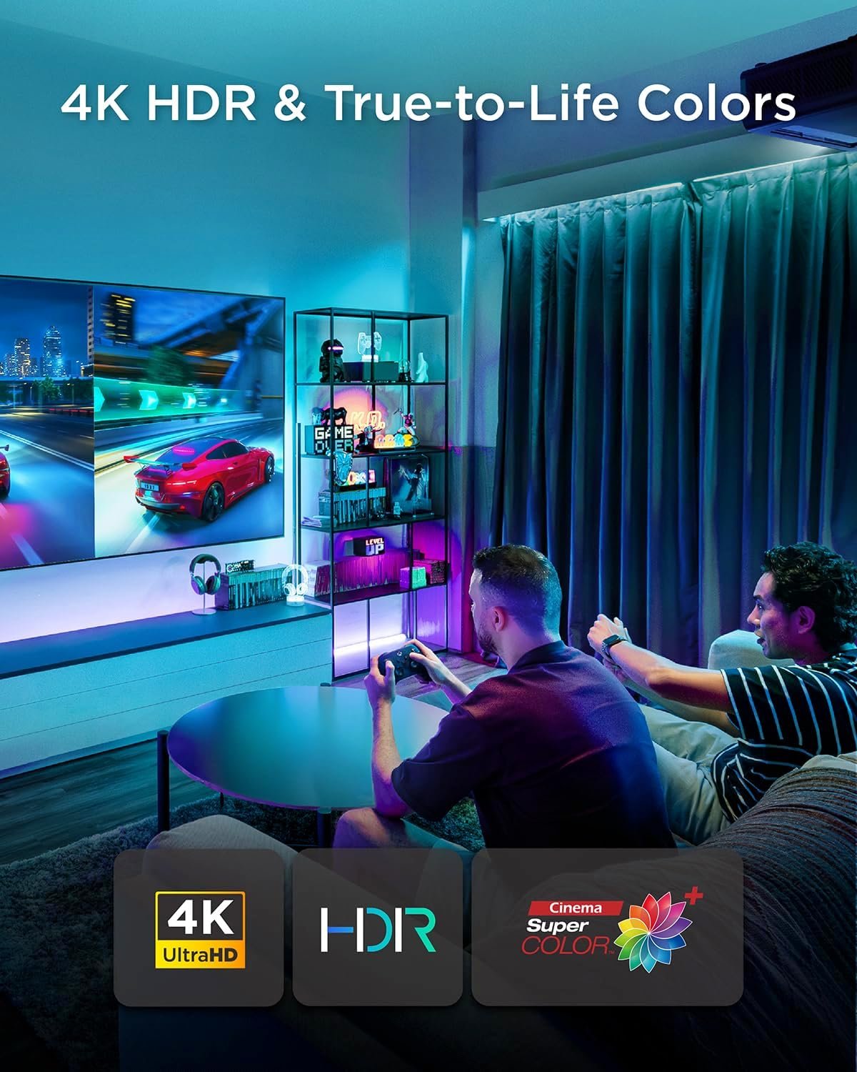 The projector offers native 3840 x 2160 4K resolution for crystal-clear visuals and detailed imagery. Moreover, it supports HDR content, enhancing contrast and color vibrancy for cinematic viewing experiences.