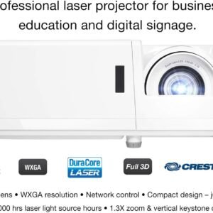 The Optoma ZW400 WXGA Professional Laser Projector delivers bright, clear projection, long-lasting performance, and professional-grade reliability, making it ideal for classrooms, offices, training rooms, and small to medium-sized venues. Moreover, it incorporates DuraCore laser technology, providing up to 30,000 hours of maintenance-free operation for continuous use.