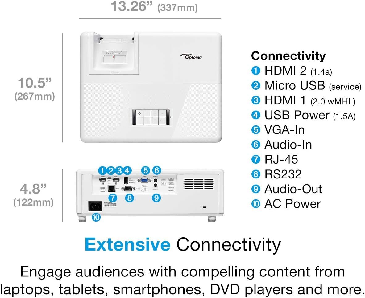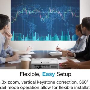 It operates quietly, thanks to low-noise cooling, ensuring minimal distraction during meetings or lectures. In addition, advanced connectivity options include HDMI, VGA, USB, and LAN, providing flexibility for various devices and multimedia sources.